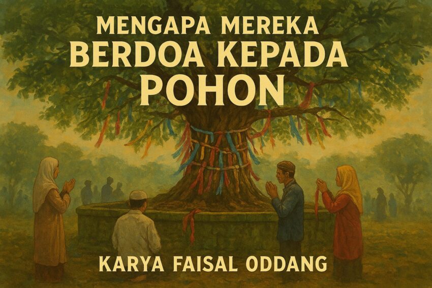Aku tumbuh menjadi pohon. Orang-orang di kampung kami akan tetap percaya bahkan jika harus didebat hingga mulut berbusa. Merekamulai memercayainya sejak tahun 1947. Kini, pohon asam itu sudah besar dan semakin tua. Kira-kira dapat diukur dengan lima orang dewasa melingkarkan lengan untuk mampu memeluk batangnya. Hampir setiap hari orang merubut di sana mengucapkan doa yang rupa-rupa jenisnya lantas mengikatkan kain rupa-rupa warnanya dan berjanji membuka ikatan itu setelah doa mereka terkabul. Jadi jangan heran ketika di ranting, dahan, batang, atau tidak berlebihan jika kukatakan hampir semua bagian pohon penuh ikatan kain. Ada banyak doa di sana. Demi menjaga tubuhku, ada pagar beton sedada manusia, berwarna hijau lumut, mengelilingi batang pohon. Para pendoalah yang membangunnya.